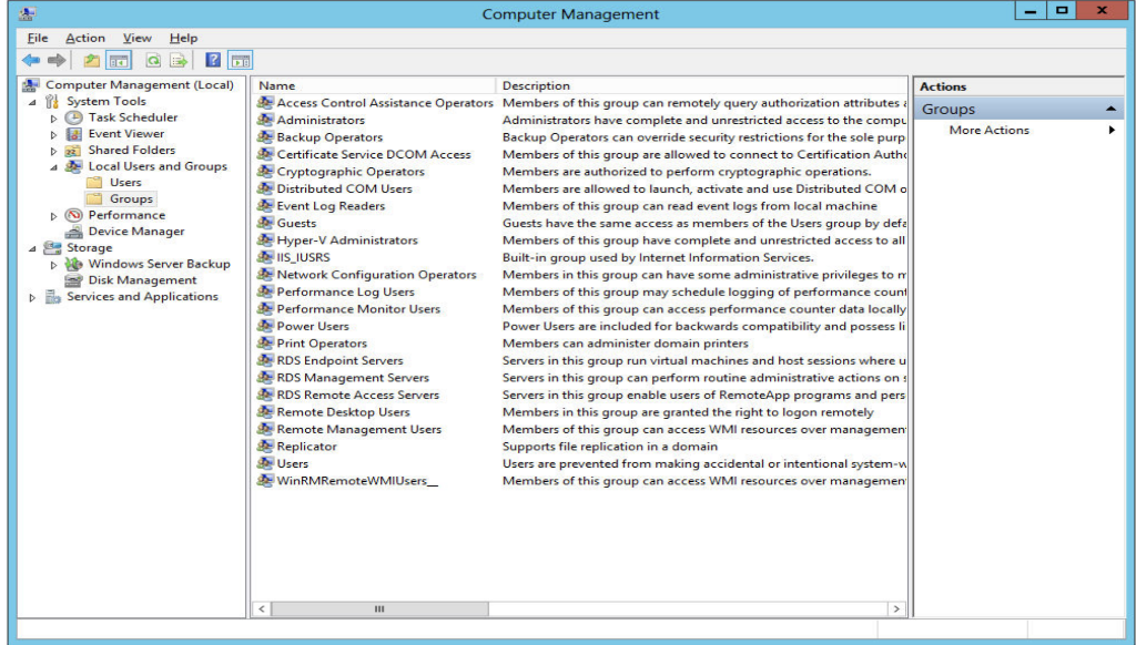 Just like a local user, a local group exists within a member orstand-alone computer, be it a server, laptop, or desktop. It cancontain local user accounts that exist on the server. It can alsocontain users or groups from the Active Directory that the serveris a member of. You can manage groups using the same GUI tools thatyou use to manage local users. You can see that there are a numberof them here by default. Windows will also add more groups if youadd certain roles.