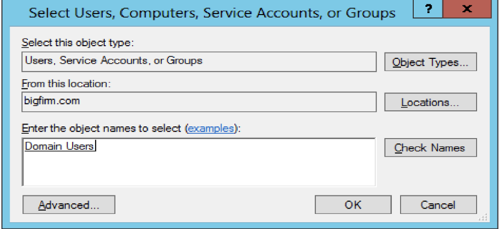 ?x Select Users, Computers, Service Accounts, or Groups Select this object type: Users, Service Accounts, or Groups From this location: bightim.com Locations.. Enter the object names to select (examples): Domain Usersl Check Names Advanced OK Cancel